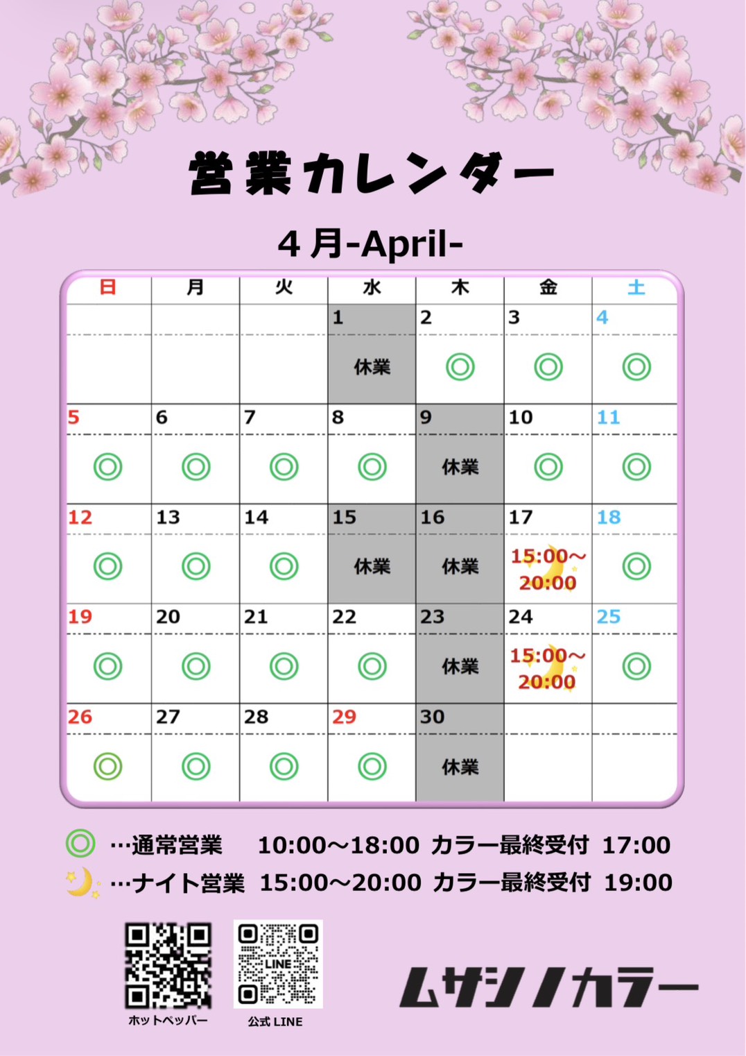 【休業日】 3日(火)・4日(水)・12日(木)・18日(水)・19日(木)・25日(水) 【ナイト営業日】 20日(金)12:00~20:00、27日(金)15:00~20:00(カラー最終受付19:00)